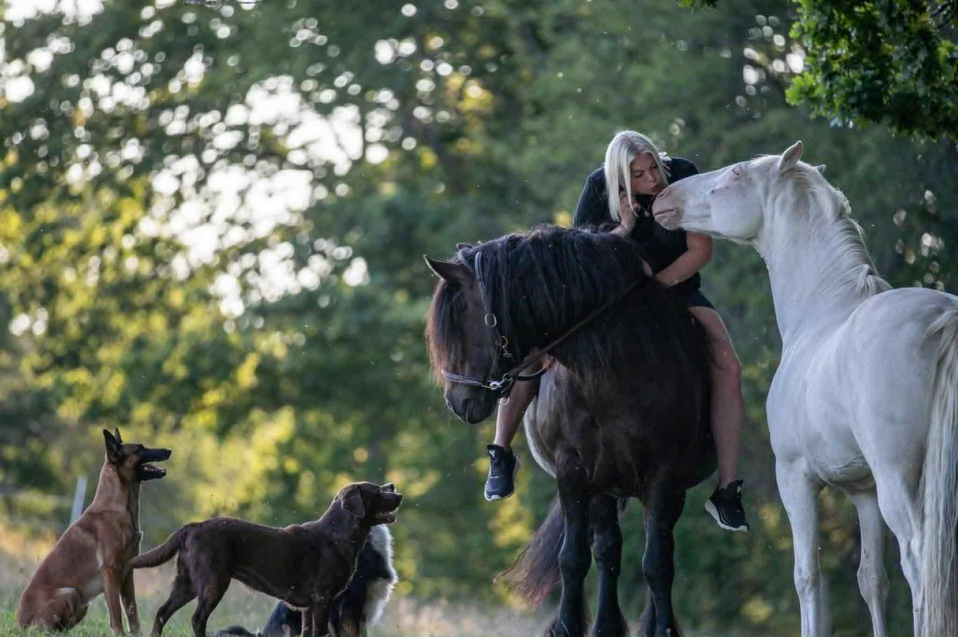 På gården bor jag tillsammans med min sambo. Här bor också sex hundar, fyra hästar, två grisar samt katter och kaniner.